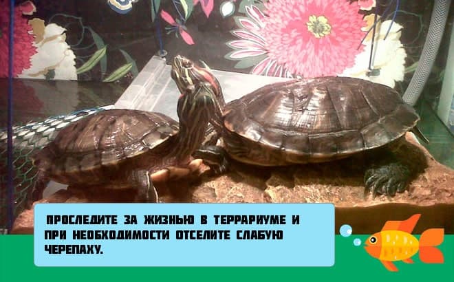 - Водным черепахам необходимо место для отдыха вне воды. Убедитесь, что пространства хватает для всех обитателей.