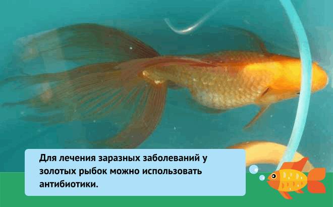Флексибактериоз (колумнариоз). Это заболевание развивается в загрязненной и слишком теплой воде. Начальная стадия болезни поддается лечению. Симптомами являются обесцвечивание хвоста с последующим разрушением, а также ерошение чешуи в области хвоста, побледнение краев чешуи, осветление области рта и ограниченность движений. Погружайте золотую рыбку в раствор марганцовки розоватого оттенка на 10–15 минут в течение 3–5 дней. Также можно применять левомицетин (50 мг на 3 литра), добавляя его через день на протяжении недели. После этого следует вводить канамицин (1 г на 20 литров) по аналогичной схеме.