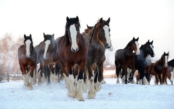 Что касается размеров, то Владимирские тяжеловозы немного уступают Клейдесдалям: средняя высота в холке жеребцов составляет около 165 см. Вес колеблется в пределах 650-750 кг. Основные масти у Владимирцев, как можно увидеть на множестве фотографий, – гнедая и рыжая, в то время как вороная встречается реже. В отличие от своих предков, у них никогда не бывает белых отметин на теле, допускаются лишь небольшие отметины на ногах и голове.