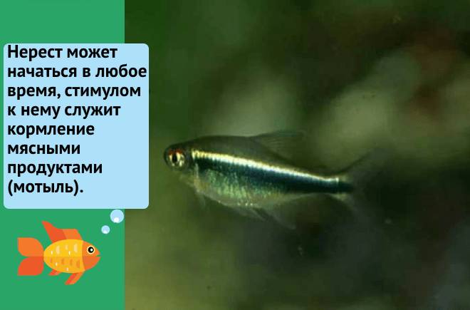| Внешний вид | Стройное тело, серебристо-черная полоса вдоль бока, красная полоса под ней. | Обеспечьте темный грунт и фоновое освещение для усиления окраски. |