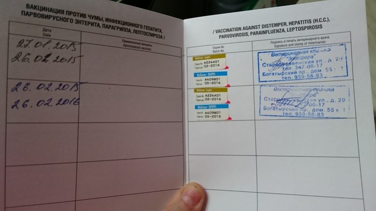 - При ревакцинации жизненно важно использовать препараты тех же производителей, которые были использованы при первичной прививке. Для того чтобы не перепутать, необходимо вести график вакцинаций в специальном паспорте собаки.