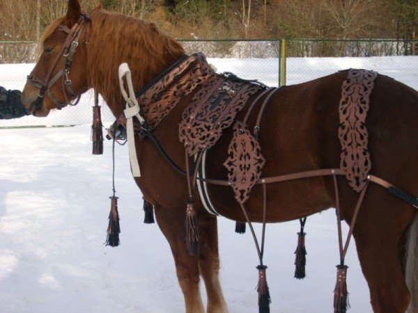 Не менее важным элементом является подбрюшник – эта деталь упряжи предназначена для надежной фиксации положения снаряжения. Подбрюшник крепится на оглоблях, а дуга соединяет хомут с ними при помощи гужей. Можно сказать, что дуга выполняет роль амортизаторов во время рывков, поэтому она должна быть максимально прочной.