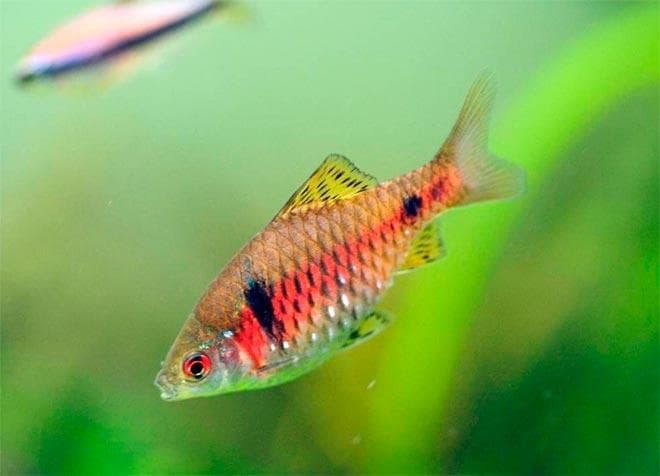 Яркая окраска: Алые барбусы известны своим ярким красным цветом, который особенно выражен у самцов. Эта окраска не только делает их привлекательными для аквариумистов, но и служит средством привлечения партнёров во время нереста.