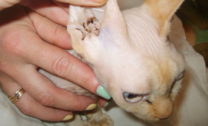 Ушной клещ Отодектес паразитирует в слуховых проходах животного зачастую из-за неправильного ухода. Недуг проявляется сильным зудом, расчесами, неприятным запахом от ушей и темно-серыми выделениями. Кожа в пораженных местах краснеет, температура тела повышается, животное постоянно трясет головой и чешет уши. Из-за нестерпимого зуда кошки могут расчесать себе огромные раны за ушами.