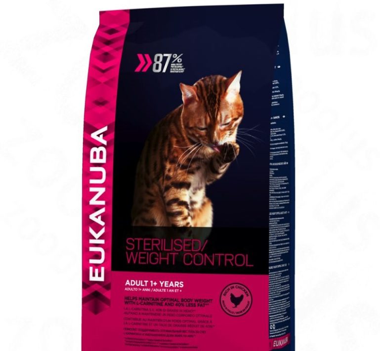 Eukanuba Sterilised Weight Control. Этот корм предназначен для стерилизованных кошек с избыточным весом. Высокий рейтинг обусловлен сбалансированным составом, который включает необходимые питательные вещества, способствующие улучшению состояния шерсти и кожи, а также нормализации пищеварения у ваших любимцев.