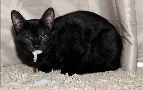 Бывает, что у кота пена изо рта идет вместе с волосяными шариками