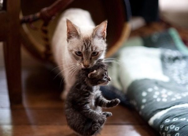 В момент перетаскивая кошка сильно сжимает зубы, держит малыша за шкирку или тащит по полу более подросшего котенка. Такой способ передвижения может стать причиной серьезных травм.