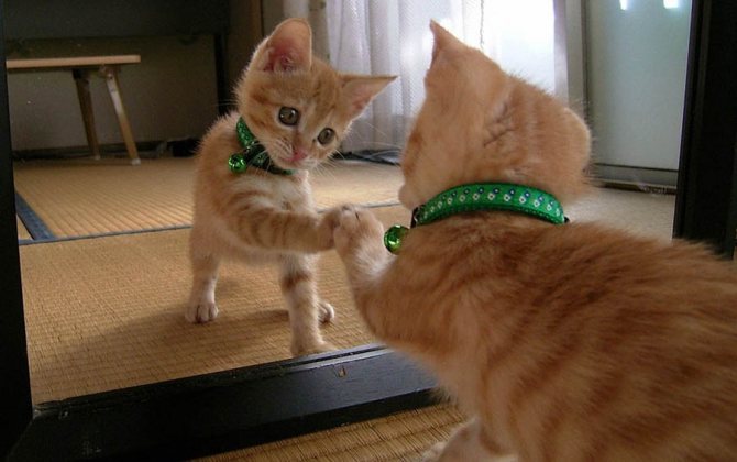 Ответ на вопрос, узнают ли кошки себя в зеркале, отрицательный. Интересно, что они могут узнавать хозяина, глядя на его отражение. Когда питомец смотрит на зеркало и видит, как в нем отразился вошедший в помещение человек, наблюдается оживленная реакция: кошка издает звуки, поворачивается в сторону вошедшего. Правда, пока никому не удалось выяснить, воспринимается ли отражение как отражение или как другой человек.