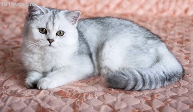 - Серебристый. Признан наиболее распространённым окрасом породы. Живот и грудь кошек почти всегда белые, тёмные участки локализуются на спине, боках и хвосте.