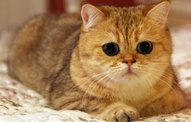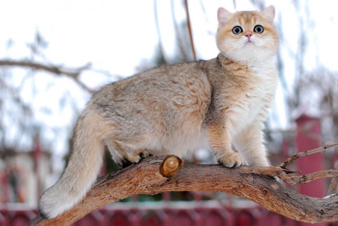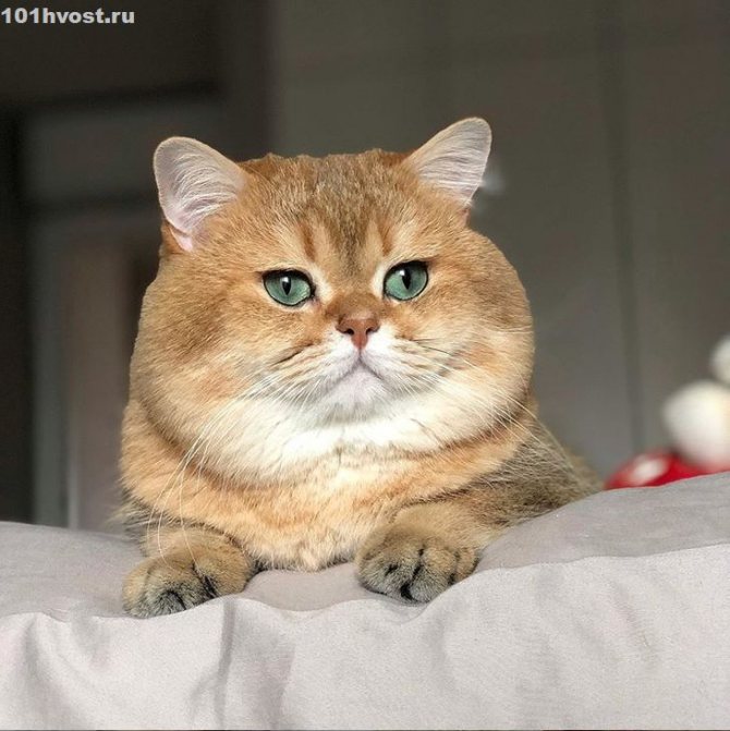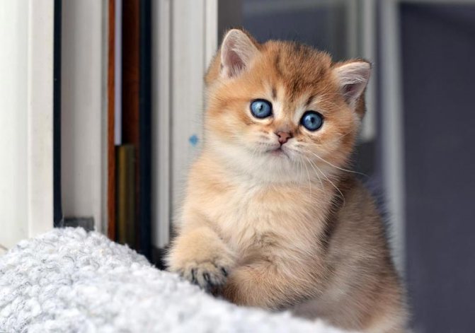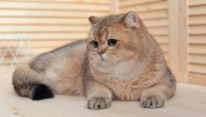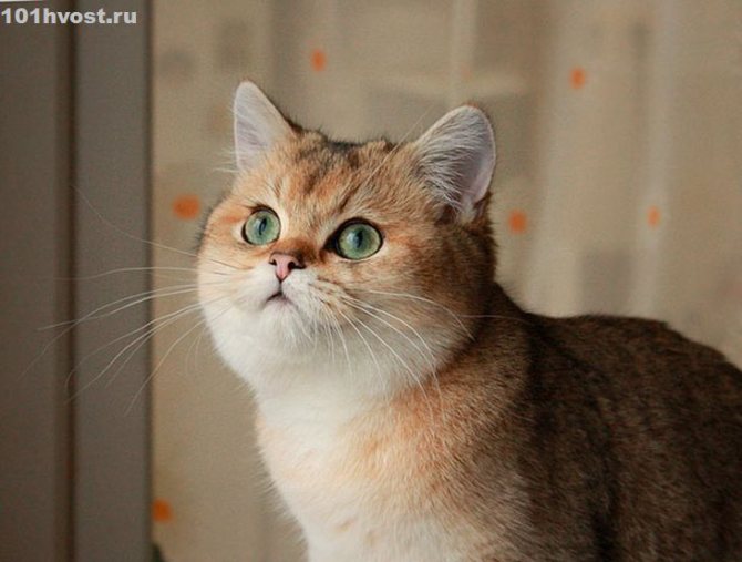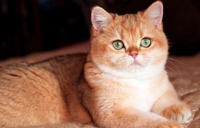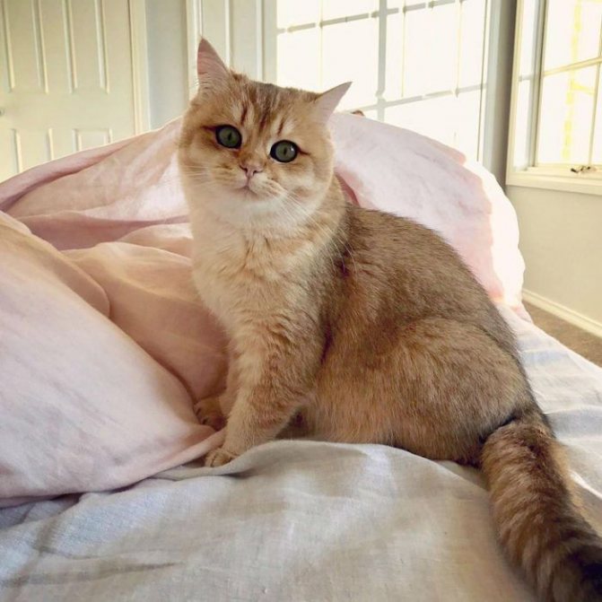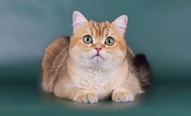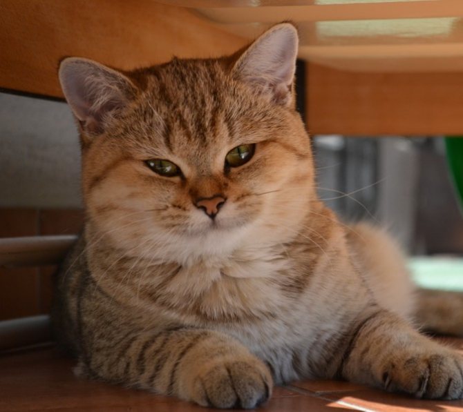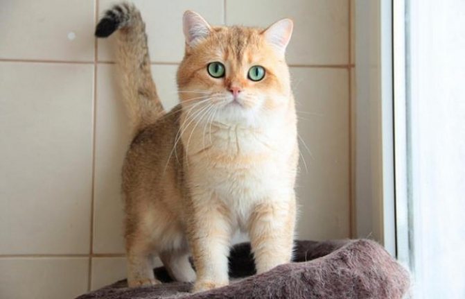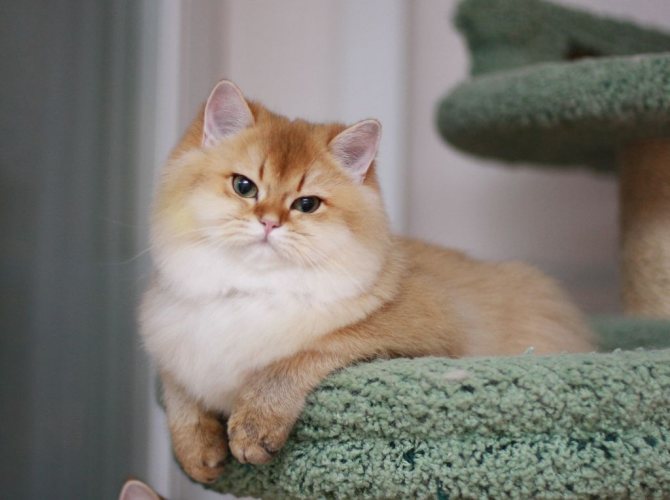 - Золотой. Шерстяной покров таких кошек отличается нежным персиковым оттенком. Этих питомцев ещё называют британская рыжая шиншилла.