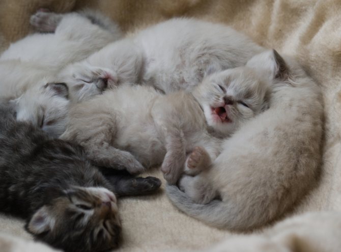 О том, что еды котятам не хватает, можно узнать путем их ежедневного взвешивания — каждый день котята должны поправляться, в среднем, на 10 граммов. Для искусственного вскармливания существуют специальные смеси для новорожденных котят.
