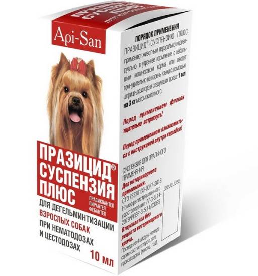 Что касается суспензии, то Празицид именуется со словом Плюс и также является комплексным препаратом для применения внутрь. В 1 мл вещества содержится 45 мг фебантела, 45 мг пирантелапамоата, 15 мг празиквантела, а также плюс дополнительные компоненты. Суспензия имеет вид светло-желтой жидкости без особого запаха. При длительном хранении могут появляться сгустки, поэтому перед использованием нужно хорошо взбалтывать. Дозируется для продажи Празицид Плюс во флаконы по 10 мл с входящим в комплект шприцем-дозатором. Так же, как и в упаковке таблеток, имеется стикер для вклеивания в ветпаспорт.