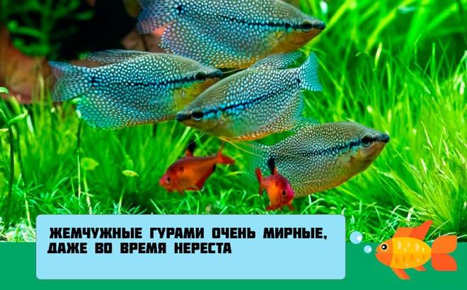 Совместимость гурами с другими видами рыб может вызвать определенные трудности. Жемчужные гурами отличаются миролюбивым и осторожным характером. Агрессивные виды рыб могут создать для них неблагоприятные условия. Даже мирные соседи могут случайно повредить гурами, приняв их плавники за червяков.