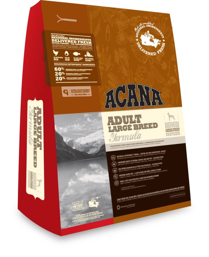 Сухой корм Acana Adult Large Вreed предназначен для взрослых крупных собак весом более 25 кг. Он производится на заводе в Альберте, единственном на всей планете. Сюда поставляются свежие и качественные ингредиенты, из которых тут же производится питание для собак, которое экспортируется в разные страны.