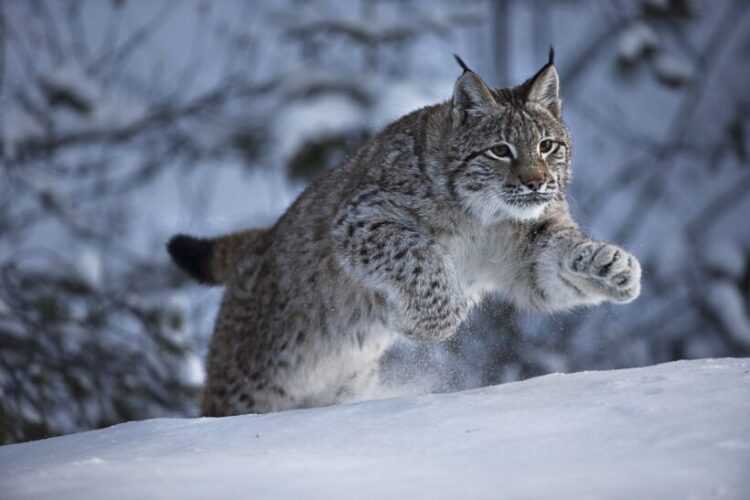 Рысь хорошо чувствует себя зимой, прекрасно перенося морозы, может переплыть холодную реку.
