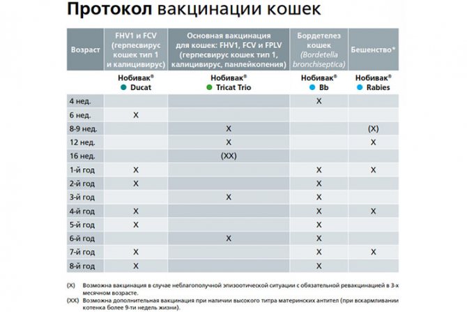 Первичная вакцинация котят происходит в 2—3 месяца. Обычно используется комплексная прививка. Чаще это вакцина «Нобивак». Ревакцинация делается через 2—4 недели. Срок варьируется исходя из того, от какой болезни прививка. Вводить препарат от бешенства необходимо в 8—12 недель, тогда организм котенка уже готов. В зависимости от производителя вакцины, действует 1 год или 3. Поэтому ревакцинировать надо исходя из срока действия (то есть раз в 1—3 года). Есть подробная схема вакцинации кошек, в которой отображен возраст и необходимая прививка.