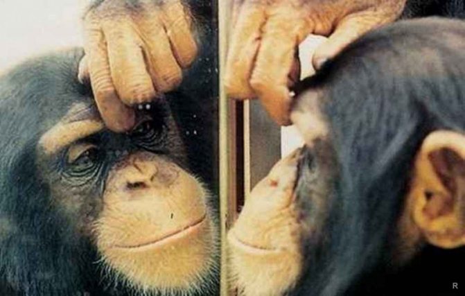 В 1970 году американский зоолог Гордон Гэллап проследил за поведением приматов перед зеркалом. Оказалось, что человекообразные обезьяны — шимпанзе, гориллы и орангутаны опознают в зеркале именно себя. Сперва они воспринимают свое отражение как другое животное, но спустя некоторое время начинают обыскивать шерсть, руководствуясь тем, что видят в зеркале.