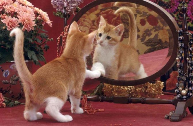 Некоторые расценивают свое отражение как потенциального друга, особенно котята, которые с энтузиазмом пытаются играть с новым приятелем.